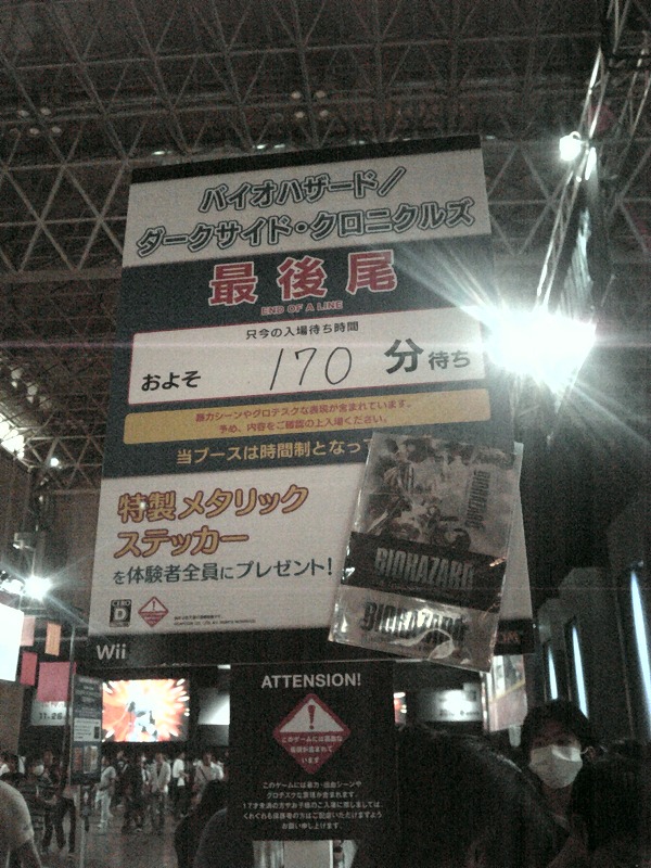 × [PR]上記の広告は3ヶ月以上新規記事投稿のないブログに表示されています。新しい記事を書く事で広告が消えます。 バカ長いです。お時間ある人のみどうぞ。 予定より1時間遅れてorz出発(起きられなかった…)。 東西線の各駅に乗ってまして電車が地上に出てからふと2度目の乗換検索やってみたら到着時間が最初にやったときより20分以上遅れてるんですけど! 快速の存在すっかり忘れてた…orz ちゃんと見とけよ自分。 でもこの手のソフトって結構余裕を見て検索するのでもしやと思い西船の駅で猛ダッシュした所、ギリギリ間に合いました。 ただでさえ出発が遅かったのにムダに待ちぼうけは食らいたくないですからね。 会場着いて行列待ちすること数十分、やっと入れました。 日差しがかなりきつかった… 荷物検査結構かっちりやってましたね。これがなければもっと早く入れたかも。 自分のカバンを見たおばさまに「これは重いわねぇ」と言われる(苦笑)。 いや、これでも軽くしてきたつもりなんですが… 入り口でパンフ取って早速目の前のカプコンブースにてDVD&フォトブックをもらってからバイオDCブースを撮影。 で、並ぼうとしたら既に約3時間待ち。 覚悟はしてたけど何よりこの時はげんなり感が強く、隣のゴーストトリックを見てみるとこちらは約1時間待ちとのこと。 先にこっちに並ぶことにする。 並ぶスペースが余りないためか、自分と数人が入ったところで入場規制入りました。 新規タイトルなのにブース内はPVにあった処理場をイメージしたセットでかなり気合いが入ってます。 看板にあった時間より30分ほど早く入れました。 手指消毒して席に着く。 台詞回しはもうタクシュー節全開。これだけでもう買い決定。 女刑事の「体験版はお祭りですから!」にウケた。 キャラの動きはなめらかだしテーマ曲も良いなぁ。 シンセ全開だけど聞き飽きない。 ゲーム内容については分かりやすい説明があったので某所よりコピペ。 ========= ステージにいろんなオブジェクトがあって、主人公はそれに「トリツク」ことでワンアクション起こせる (例えばギターなら「鳴らす」、自転車なら「こぐ」とか) するとそのオブジェクトのアクションがステージに反映されて、状況が変わって話が進んでいく それを繰り返して行く。 そのオブジェクトがどうアクションするか想像して取りついて、アクションを起こしてステージがどう変わったか判断して、 次にトリツクものを決めていく 制限時間もあるから緊張感はある(考える時間は自由に取れるけど、「トリツク」、アクション動作では時間を消費する) ========= 制限時間があったのでちょっと焦りましたがなんとかクリアできました。 オブジェクトを色々いじくるのが楽しかった。 女刑事は逆転の茜ちゃんが被って仕方なかったですね。 主人公のグラサンはかなりぶっ飛んだ人かと思ったらすごく真面目な人みたいでプレイ中ずっと誰かと被るなーと考えてたんだが後になって気付いた。 ミッちゃんだ。 更に後になって立ちイラストもそっくりなことが発覚しますた(笑 脱線したので話戻して…まぁ死んだと同時に記憶まで失ってるからああいう態度なのかもしれないけど。 公式サイトはこちら またWiiのみんチャンでもムービーを見ることが出来ます。 アンケート書いてネタバレストラップ(これがまたナイスな出来♪)を貰い、ブースを出てバイオDCに行ってみる。 まさかの240分待ち とりあえず保留ということで隣の新作シアターに入る。 ↑入り口はこんな感じ。 大神伝のBGM良すぎだろ…って言うかこのシリーズの音楽はまさに神だと思う。 独特の絵柄も素敵。 今月WiiでPS2版の移植が出るので買おうかと思ってます。 ロストプラネット2って未来版モンハンか? 映像凄かったッス。 バイオDCの後、5のシナリオ追加版の告知してましたな。 5序盤のムービーにあったジルが失踪することになったアレがそうです。 Wiiリモコンみたいなのに対応してるとのことでちょっと気になるじゃねーか! ……そうだよなー、4も後になって追加シナリオ入ったもんなー カプコンめ……!(笑) カプコンブース1周してイベントの時間を確認してから隣のレベルファイブへ行ってみる。 随分広いスペース取ってましたな。写真は側面より撮ったものなんですが奥行き分かりますかね? 流石250人体験できるだけある。 ムービー自体は外野からでも見ることは可能でした。 ちなみにこの日の体験受付は既に終了してました(^^; 隣のホールに行こうと思ったけど入ってすぐのコナミブースでときメモ(多分)ライブやっててとても人が通れる状態じゃなかったのでUターンして少しうろうろしてみる。 ゲーム大賞投票会場にて。抽選品かね。 まさかここで桜井さんの名前とピンク玉を見ることになるとは。 特別企画の戦国武将展にて写真を撮りまくる。 http:// ↑ここで全員分見られます。当然ながら自分が撮ったのより断然綺麗。 これだけの鎧のレプリカ(小十郎だけ本物?)がゲームイベントに並ぶな
