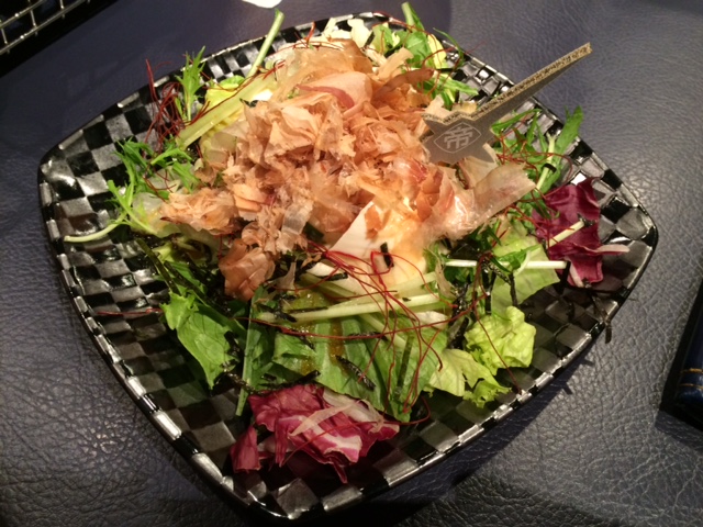 なるほど君(先祖)の豆腐サラダ。コラボメニューにも豆腐サラダはありましたがオクラが無くなり鰹節と葉っぱ系沢山。
